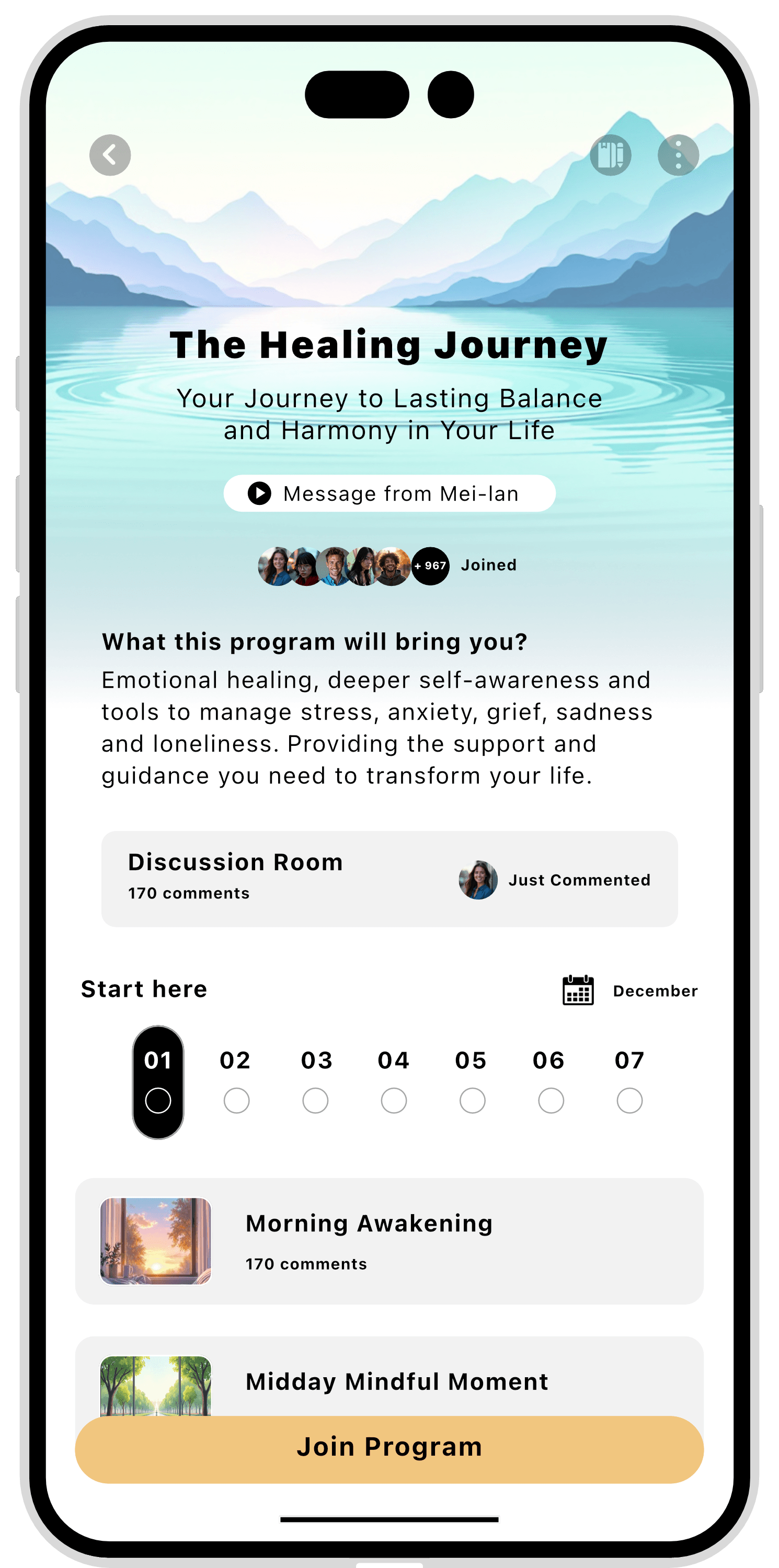 Each day, you’ll be guided through an immersive theme that helps you reconnect with your inner self, find balance, and cultivate a sense of harmony. You'll develop a toolkit of practices that support your mental, emotional and spiritual well being.